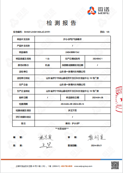 護小俠空氣消毒杯檢測報告